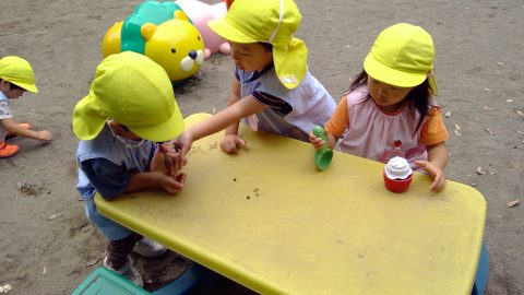 園庭には落ち葉や木の実が落ち始め、子どもたちはお外遊びで植物を集めたり砂の入ったカップの玩具に飾ったりと、お友達と一緒に夢中になって拾っている様子がありました🍂