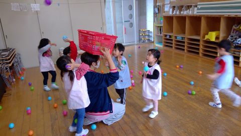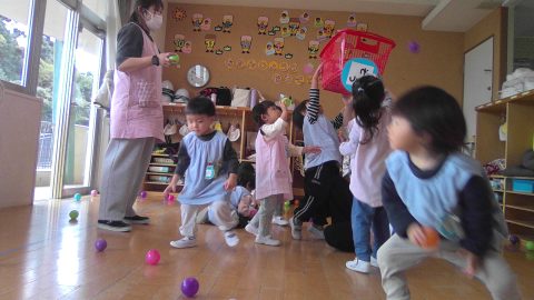 ゲーム遊びでは、運動会練習で行っている玉入れをしたクラスもあり、たくさんボールが入ったかごを見て「やった!」と、拍手をしながらとても喜んでいる様子でした✨