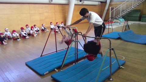 筋肉マッチョで鉄棒にぶら下がる練習をして、足抜き周りを習いました。
