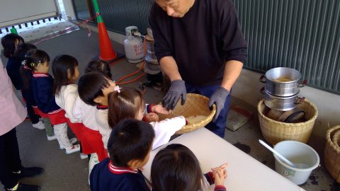 そして金曜日は、みんながずっと楽しみにしていたおもちつき会でした!もち米が蒸された様子を見せてもらった後、新ホールでお餅を「よいしょー!」とつきました。もち米からお餅に変化していく様子にみんな興味津々‼👀おもちつきを頑張ったみんなには、もち米から出来たおかきのプレゼント🎁子どもたちにお話を聞きながら、是非一緒に召し上がってくださいね😋