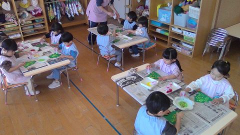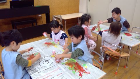 まずは自分達でオリジナルのリボンを塗った後は、リースを重ね切りしたり、鈴やリボンの切る場所に気を付けながら一生懸命作ることができました!この後は、きらきら折り紙や紙テープで飾りつけをしたり、雪を降らせたりしながら楽しく作っていきたいと思います☺