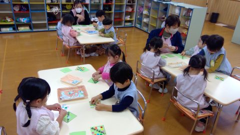 11月の製作帳では、お芋作りを行っています!前回作ったお芋と切った葉っぱをつるに見立てた紙テープに貼り付けました!貼るものが沢山ありましたが、一生懸命作ることができ完成した作品を見て達成感を感じる子ども達でした☺