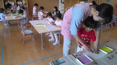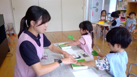 各クラス異なる色の絵の具を使い、両手に絵の具をつけて画用紙に手形をぺったん👐