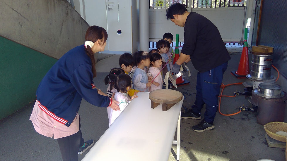 また、金曜日にはおもちつき会にも参加しました。大きな杵やうすに大興奮の子ども達!!お餅を「ぺったんこ!」と元気よく言いながらついていました✨ペアになったお友達と協力しながら一生懸命取り組んでいましたよ。